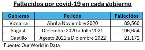 En efecto, revisando la información disponible en la plataforma «Our World in Data» de la University of Oxford (Inglaterra), figura que durante el Gobierno de Martín Vizcarra, murieron 89,560 a consecuencia del covid-19, pero durante el Gobierno de Francisco Sagasti hubieron 106,654 muertos, elevándose la cifra de fallecidos por covid-19 a 196,214 al culminar su mandato. En el Gobierno de Pedro Castillo, la cifra de muertos por covid-19 bajó a 21,172.
