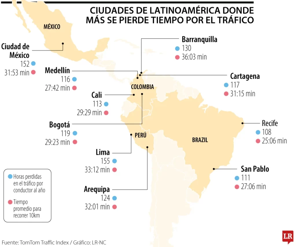 Barranquilla, Bogotá y Cali, entre las ciudades de Colombia que más tiempo pierden por el tráfico La primera ciudad de esta región del mundo donde más horas se pierde al año por culpa del tráfico es Lima, Perú, con 155 horas. ¿Usted ha sentido que el tiempo no avanza cuando está en un embotellamiento? El tráfico […]