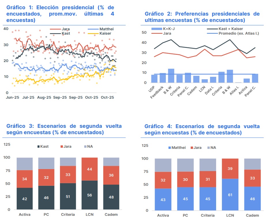 Credicorp Capital señala que la Bolsa de Santiago subiría 10% si Kaiser pasa al balotaje, pero le da un 70% de probabilidad a Jara vs Kast en segunda vuelta
