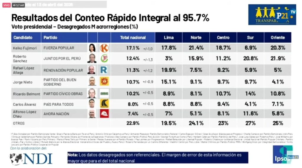 Minutos después del mediodía, Álvaro Henzler de Transparencia, presentó el conteo rápido que no hicieron ayer, pero decidieron acatar la exhortación del presidente del JNE, Roberto Burneo, de no presentar encuestas hasta que termine las elecciones del lunes en las mesas donde no se votó ayer. Sin embargo, en la medianoche, Datum soltó un conteo […]