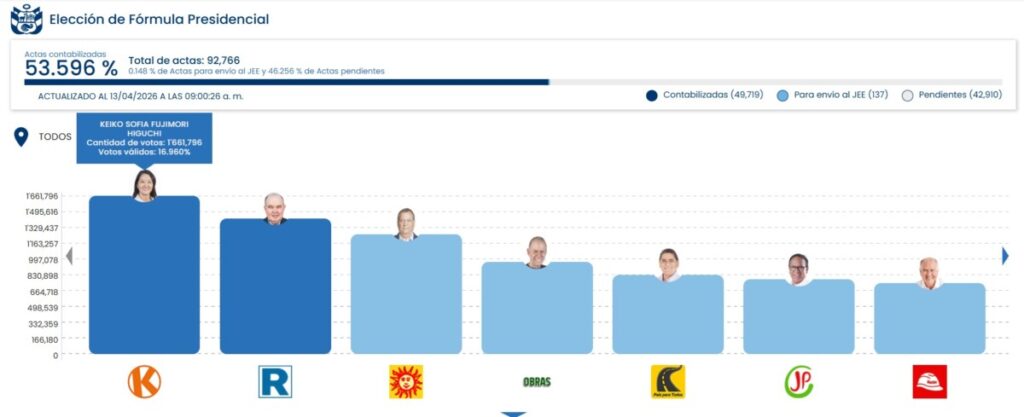 La ONPE está publicando sus resultados online y al 53.596%, Keiko Fujimori lidera el conteo con 1’661,796 votos, el 16.96% de los votos válidos, seguida por López Aliaga con 1’423,749 votos (14.531%) y Jorge Nieto con 1’254,580 votos (12.804%). El resto de candidatos está por debajo de un millón de votos. Roberto Sánchez, quien salió […]