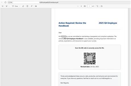 • Falsas notificaciones de RR. HH. que instan a los empleados a revisar o firmar documentos, como calendarios de vacaciones, o incluso a consultar listas de personal despedido, dirigiéndolos finalmente a sitios de robo de credenciales.