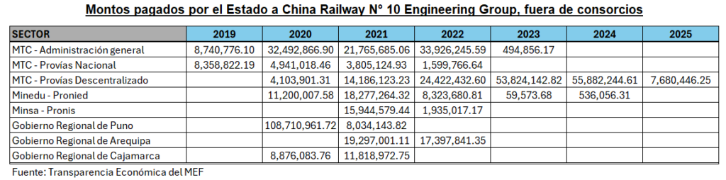 La constructora China Railway N° 10 Engineering Group Co., Ltd. Sucursal del Perú, recibió pagos del Estado por S/ 506.6 millones en el período 2019-2025. Los mayores montos provinieron de Provías Descentralizado (S/ 160.1 millones) y Gobierno Regional de Puno (S/ 116.7 millones), de acuerdo al portal Transparencia Económica del MEF (ver cuadro abajo). Este monto no incluye los consorcios en los que pudo haber participado China Railway N° 10, que también son varios.