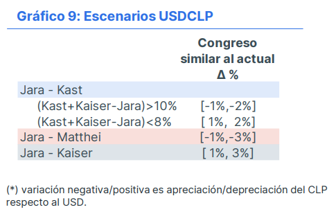 Sobre el peso chileno (CLP) y su posición en el mercado de cambios, el reporte indica: «Escenario base (Jara-Kast) no sería una sorpresa para el mercado y pondría el foco en la suma de votos de Kast mas Kaiser. Si esa suma supera en 10 puntos porcentuales (pp) los votos obtenidos por Jara, el CLP podría apreciarse entre [1%, 2%]. Si esta diferencia es menor a 8pp, CLP podría depreciarse entre [1%, 2%]. En un escenario alternativo con Matthei avanzando a segunda vuelta, el CLP podría apreciarse entre [1%, 3%]».