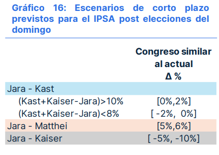 Según Credicorp Capital, como una segunda vuelta entre Jara y Kast está «ya internalizado», el IPSA, que es el principal indicador de la Bolsa Comercial de Santiago (BCS), rondaría los 10,000 puntos, ligeramente superior a como está hoy, es decir, casi inalterable. En cambio, si Matthei pasa a segunda vuelta, el IPSA, es decir, la BCS, subiría un 5%, a 10,400 – 10,500 puntos, pero si pasa Kaiser, la BCS subiría entre 5% y 10%.