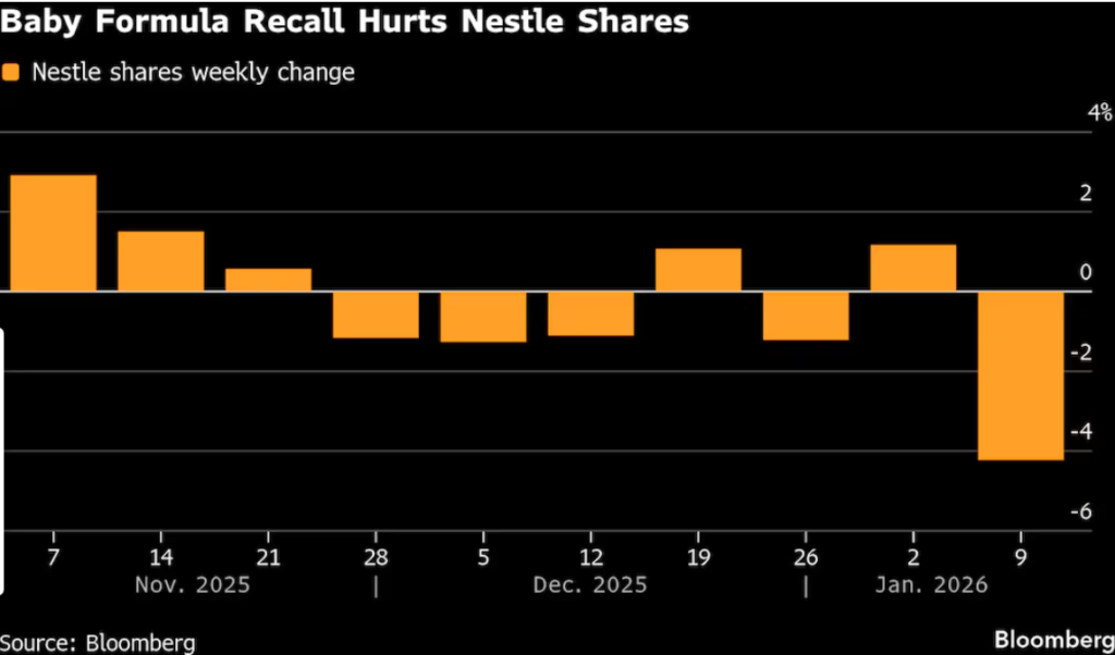 El retiro de fórmulas infantiles afecta a las acciones de Nestlé. Cambio semanal de las acciones de Nestlé.