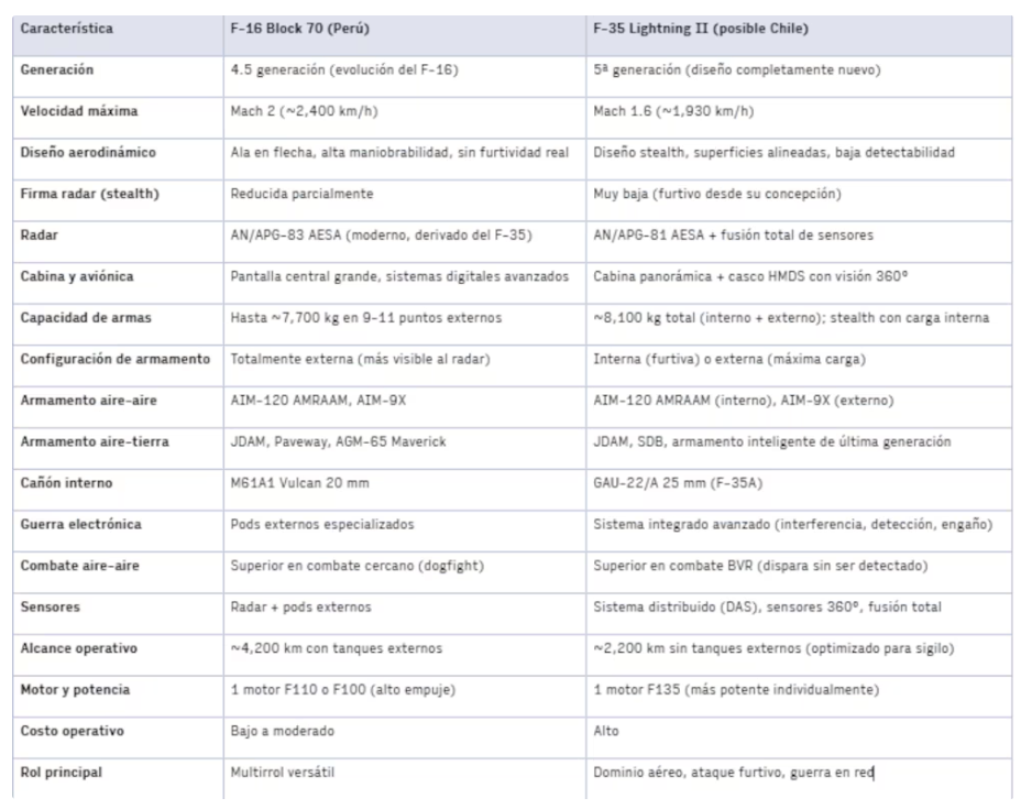 Según datos oficiales de Lockheed Martin y análisis de portales especializados como Jane’s Defence, el F-35 tiene superioridad tecnológica en combate contemporáneo, mientras el F-16 continúa siendo una opción eficiente y potente dentro de su categoría. En ese contexto, la posible compra del F-35 por parte de Chile podría redefinir el equilibrio aéreo regional.