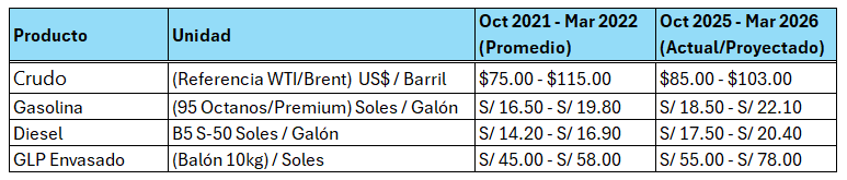 A continuación, se presenta una comparativa de los precios promedio de los principales combustibles en el mercado peruano. Los datos para el periodo de octubre 2021 a marzo 2022 reflejan el inicio de la crisis energética global, mientras que los valores de octubre 2025 a marzo 2026 corresponden a la situación actual del mercado y proyecciones recientes de entidade,s como Petroperú y el Osinergmin.