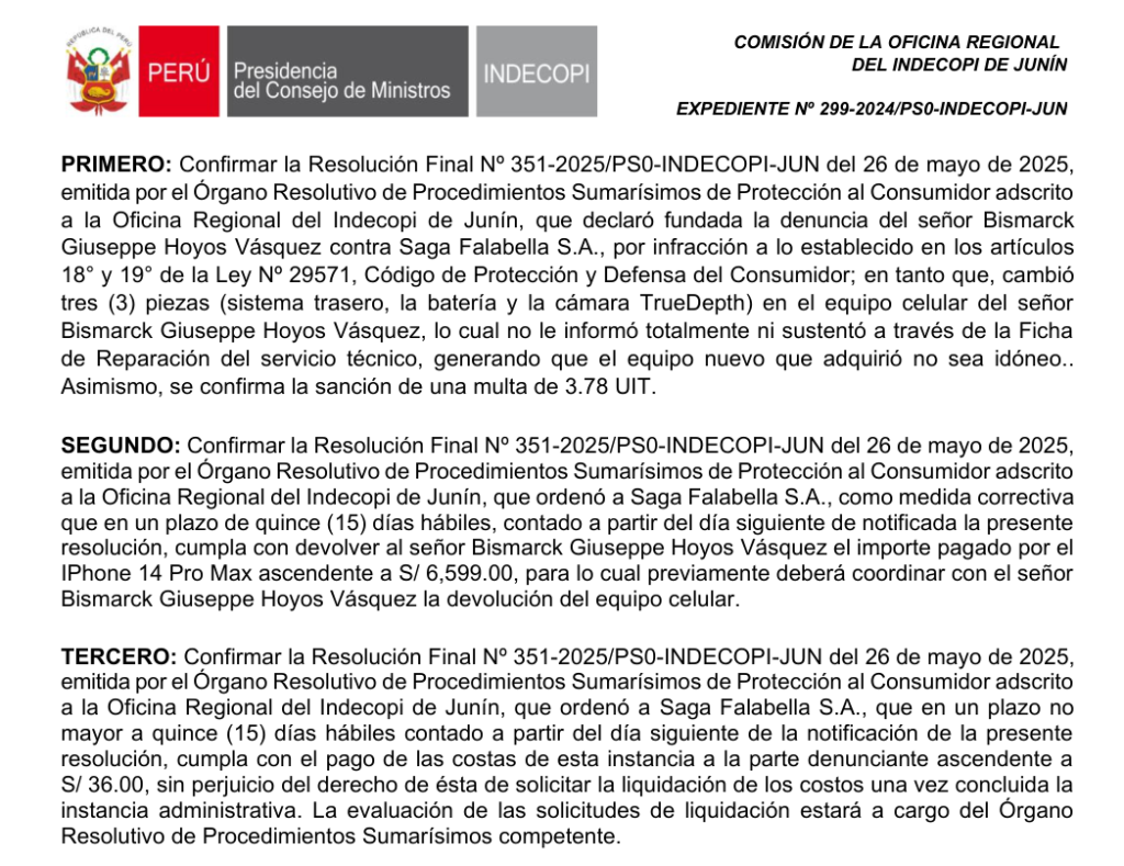 La Comisión concluyó que Saga Falabella infringió los artículos 18 y 19 del Código de Protección y Defensa del Consumidor. Por ello, además de la multa, la empresa tiene un plazo de 15 días hábiles para reintegrar al consumidor los S/ 6,599 pagados por el equipo.