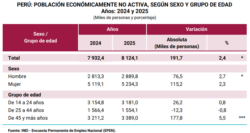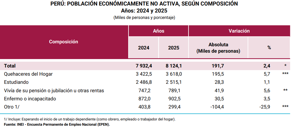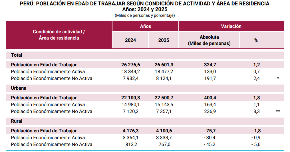 El INEI publicó su informe trimestral de Mercado Laboral a Nivel Nacional, en donde muestra que en el año 2025, la Población en Edad de Trabajar (PET) aumentó en 1.2% en comparación al 2024, alcanzando los 26’601,300 personas. Sin embargo, la Población Económicamente Activa (PEA), solo aumentó en 0.7%, llegando a 18’477,200 personas, mientras la Población Económicamente No Activa (NO PEA), es decir, aquella que no trabaja ni busca trabajo -en donde están incluidos los NiNis (ni trabajan ni estudian)- aumentó en 2.4% (el doble del crecimiento de la PET), alcanzado los 8’124,100 personas.