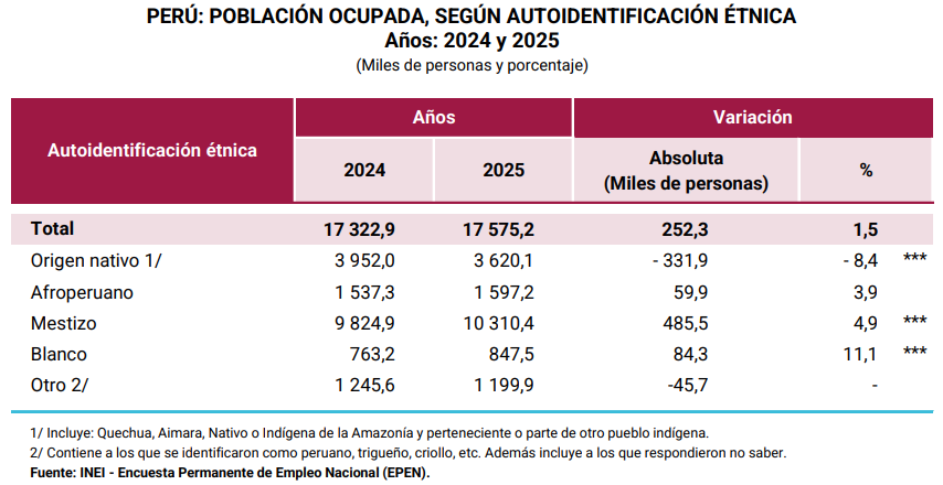 La población ocupado, o la que realmente trabaja, ascendió a 17’575,200 personas en el 2025, un aumento de 1.5% Dentro de esta población, quienes se autoidentifican como blancos, aumentaron su empleo en 11.1%, alcanzando los 847,500 personas; mientras el empleo para los mestizos aumentó en 4.9%, llegando a 10’310,400 personas ocupadas; los afroperuanos incrementaron su empleo en 3.9%, llegando a 1’597,200 personas, pero la población ocupada de origen nativo (quechua, aimara, nativo o indígena de algún pueblo) disminuyó su empleo en -8.4%, alcanzando los 3’620,100 personas.