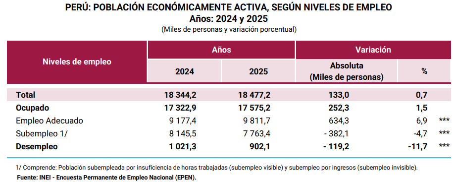 La población con empleo adecuado (quienes trabajan 35 o más horas a la semana y reciben ingresos por encima del ingreso mínimo referencial, o aquellos que trabajan menos de 35 horas pero no desean trabajar más) alcanzó un máximo de 9’811,700 personas, un 6.9% más que en el 2024. A la vez, cayó la población con subempleo en -4.7%, llegando a 7’763,400 personas.