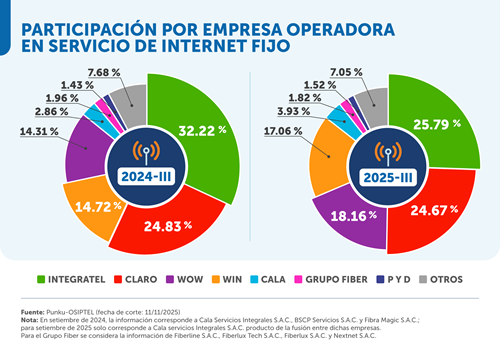 Por su parte, Integratel registró un comportamiento contrario porque perdió entre setiembre de 2024 y setiembre de 2025, 167 551 conexiones de internet fijo.