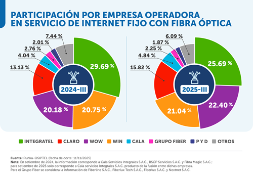 En lo que respecta a la participación de mercado del segmento de fibra óptica, destaca el crecimiento de Wow, que sumó 211 948 conexiones a setiembre de 2025, con lo cual se consolida en el segundo lugar, solo por detrás de Integratel.
