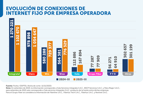 Según el análisis a setiembre de 2025, las empresas operadoras Wow, Win y Claro aumentaron sus conexiones de internet fijo en 211 948, 149 089 y 75 749, respectivamente, respecto al mismo periodo de 2024.
