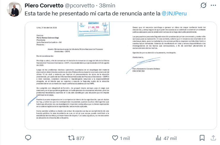 Después de la avalancha de reportajes que muestran irregularidades en las elecciones generales del pasado 12 de abril, renunció el jefe de la ONPE (Oficina Nacional de Procesos Electorales), Piero Corvetto. El congresista Segundo Montalvo había solicitado a la presidente de la Junta Nacional de Justicia (JNJ), María Teresa Cabrera, que evalúe la suspensión momentánea del jefe de la ONPE.