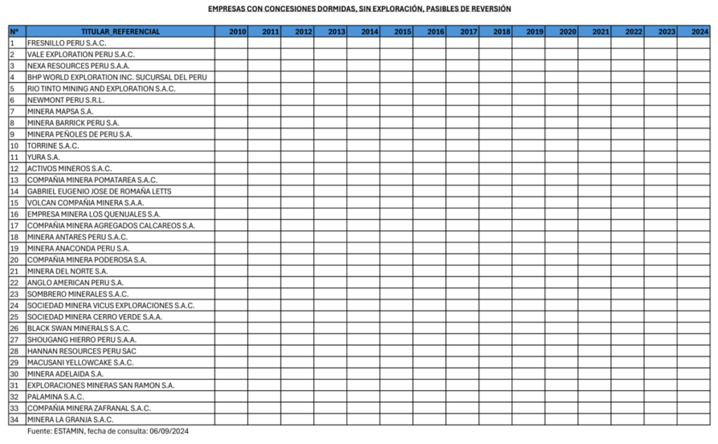 A diciembre del 2025, según el Ministerio de Minas (Minem), habían 1,197 concesiones mineras activas: 430 en explotación y 767 en explotación, es decir, solo el 2.15% de las concesiones vigentes estaban en actividad. En el régimen vigente, la gran y mediana minería paga US$ 3 por hectárea solicitada u otorgada al año, los pequeños productores mineros pagan US$ 1 y los productores mineros artesanales pagan US$ 0.50 por hectárea o su equivalente en moneda nacional.