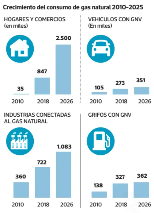 Hay más de mil empresas y 2.5 millones de hogares conectados a la red de gas natural, además de 351 mil vehículos que usan GNV. Imagen: Día 1 de El Comercio.