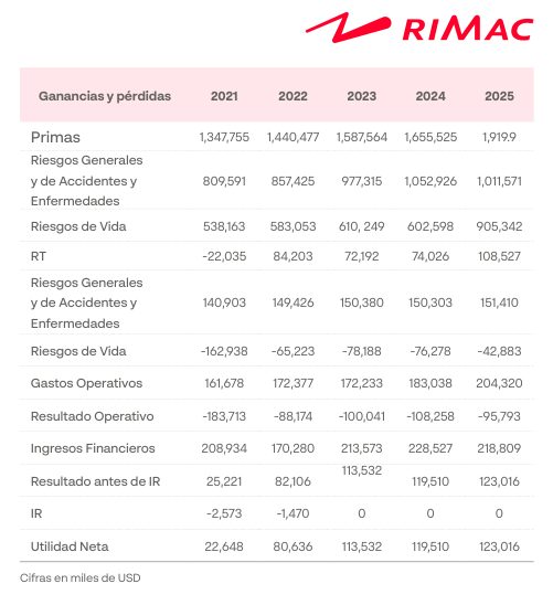 En el 2025, Rímac obtuvo primas por US$ 1,920 millones en el 2025, un aumento de 16% en comparación al 2024, con un utilidad neta de US$ 123 millones, un incremento de apenas 2.9%.