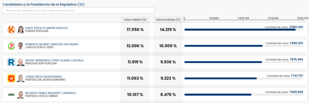 En las elecciones más luchadas de la historia, por saber quien queda en el segundo puesto para pasar a la segunda vuelta, el candidato Roberto Sánchez de Juntos por el Perú tiene apenas más de 13 mil votos que López Aliaga al 93.3% del conteo de la ONPE, con un 12% de los votos válidos, por encima del 11.91% que tiene el candidato de Renovación Popular.